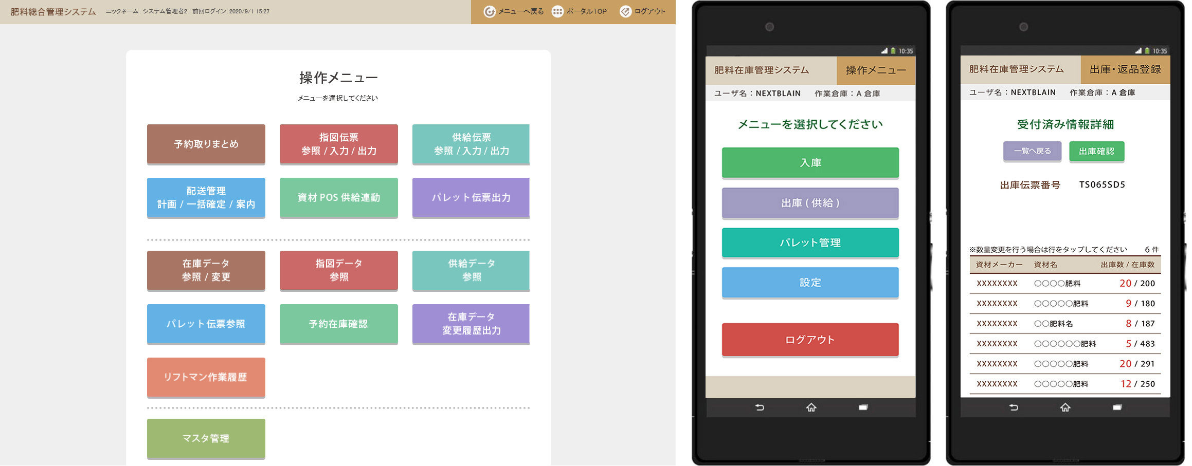 管理事務所で運用するWebシステムで商品の入庫・出庫登録と伝票発行、そして倉庫管理者が使用するスマートフォンアプリで対象伝票への確定処理を行うことにより、リアルタイムで正確な在庫管理を可能に。